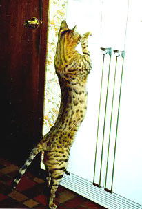 Unlike the world of domestic dog breeding, which is capable of hybridization seemingly without limit (such as the 70-foot Gigantischund, a cross between a Daschund and an Ent), the cat culture doesn't frequently squeeze out any new breed that significantly varies in size. The unnervingly dog-like Savannah housecat, though, is just monstrously big, having been created by cross-breeding with Servals, an African grassland mini-cheetah of sorts. I like to imagine that Savannahs originated by crazy, benzedrine-fueled rogue breeders who snuck into the local zoo after hours, and left Miss Precious in the African exhibit overnight until she'd taken all comers. Savannahs are said to be great with kids and other pets, combining the blind loyalty and fearlessness of Man's Best Friend with the intelligence and ESP abilities of Here Kitty Kitty. They're also extremely keen on water, and will jump into a filled bathtub without