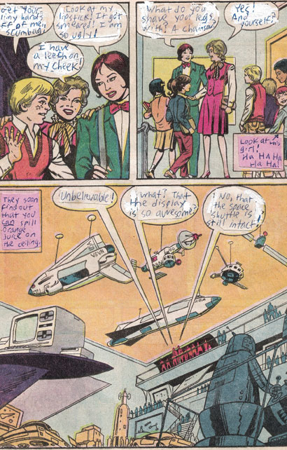 Cecil: Get your slimy hands off of me, scumbag! Mrs. Gumby: Look at my lipstick! It got smeared! I am so ugly! Mrs. Buttface: I have a leech on my cheek! Mrs. Gumby: What do you shave your legs with? A chainsaw? Mrs. Buttface: Yes! And yourself? Look at this girl! Ha Ha Ha Ha Ha! They soon find out that you can spill orange juice on the ceiling. Person #1: Unbelievable! Person #2: What? That the display is so awesome? Person #3: No, that the space shuttle is still intact!