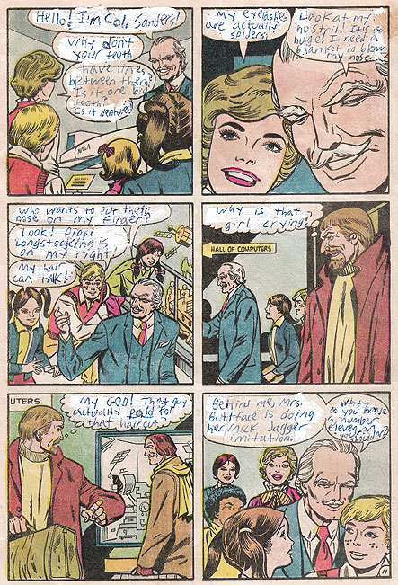 Man: Hello! I'm Col. Sanders! Mrs. Buttface: Why don't your teeth have lines between them? Is it one big tooth? Is it dentures? Mrs. Buttface: My eyelashes are actually spiders. Col. Sanders: Look at my nostril! It's so huge! I need a blanket to blow my nose. Col Sanders: Who wants to put their nose on my finger? Cecil: Look! Pippi Longstocking is on my right! Hortense: My hair can talk! Man #1 (thinking): Why is that girl crying? Man #1 (still thinking): My GOD! That guy actually paid for that haircut? Col. Sanders: Behind me, Mrs. Buttface is doing her Mick Jagger imitation. (To Cecil): Why do you have a number eleven on your shoulder?