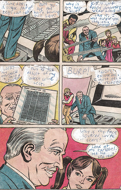 Legs: Sometimes, a single pair of legs can talk. Don't you love the hairy bowling ball here? Boy: Why is my hair blue? Col. Sanders: Kid, it isn't funny anymore. Next time you say it, I will throw you into this sewage pit. Col. Sanders: LOOK! My mooustache is skin colored! This is the result of my latest urine test. Col. Sanders: BURP! OOPS, excuse me, I must get to a restroom. Col. Sanders: Why is my face covered with scars? Look at my earlobe! Ha Ha Ha Ha!