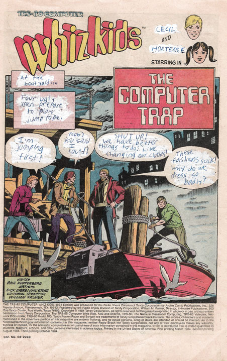 The opening page establishes what will be the central joke: Characters in a comic book commenting mostly on the comic book itself and how ugly everyone is. Handwriting transcription provided below the scan.
