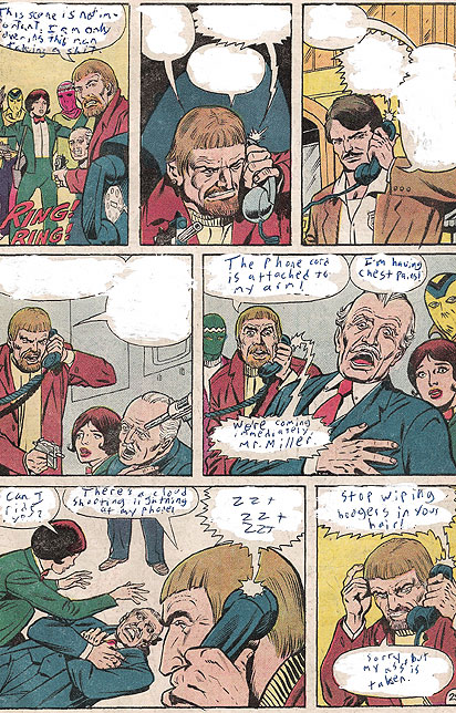 Criminal: This scene is not important. I am only covering this man taking a shit. Criminal: The phone cord is attached to my arm! Col. Sanders: I'm having chest pains! Voice on other end of phone: We're coming immediately, Mr. Miller. Mrs. Gumby: Can I ride you? Criminal: There's a cloud shooting lightning at my phone! Phone: zzt zzt zzt Voice on other end of phone: Stop wiping boogers in your hair! Criminal: Sorry, but my ass is taken.