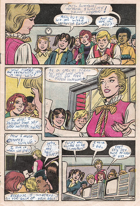 Cecil: Mrs. Buttface! Hortense glued my hands together! Hortense: Yeah, but he hit me with a carton of Ex-Lax! Girl: And she ate it, too! Girl: Who poured the strawberry jelly in my hair? Mrs. Buttface: I did! I thought your green hairstyle sucked! Mrs. Buttface: As a special treat for your hard work, you all get free Depend Undergarments! Mrs. Buttface: Now I must commit suicide. Girl: I love it when she dies! Boy: Why is my hair blue? Hortense: Because I sneezed on the back of your head! Hortense: YUCK! Who barfed on the computers? Cecil: I think I did. Girl: YAY! It's my turn to clean it up!