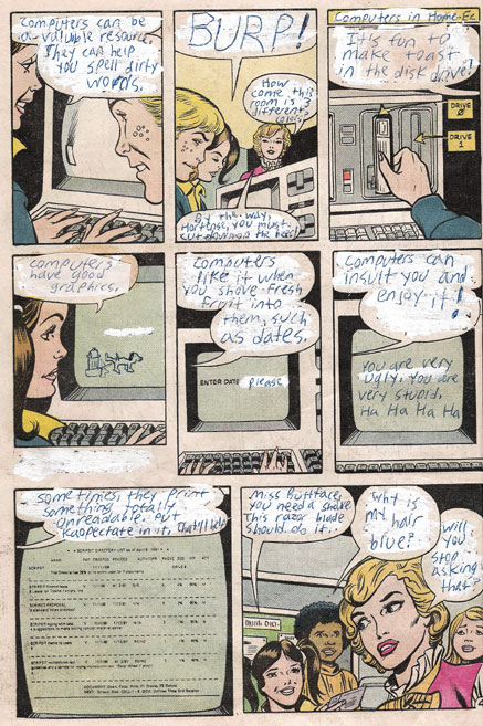 Hortense: It's fun to make toast in the disk drive! Hortense (looking at computer screen displaying dog urinating on fire hydrant): Computers have good graphics. Hortense (looking at screen displaying "Enter date please"): Computers like it when you shove fresh fruit into them, such as dates. Hortense (looking at screen displaying "You are very ugly. You are very stupid. Ha Ha Ha Ha"): Computers can insult you and enjoy it! Hortense (looking at screen displaying illegible directory): Sometimes they print something totally unreadable. Put Kaopectate in it. That'll help. Hortense: Mrs. Buttface, you need a shave. This razor blade should do it. Boy: Why is my hair blue? Mrs. Buttface: Will you stop asking that?