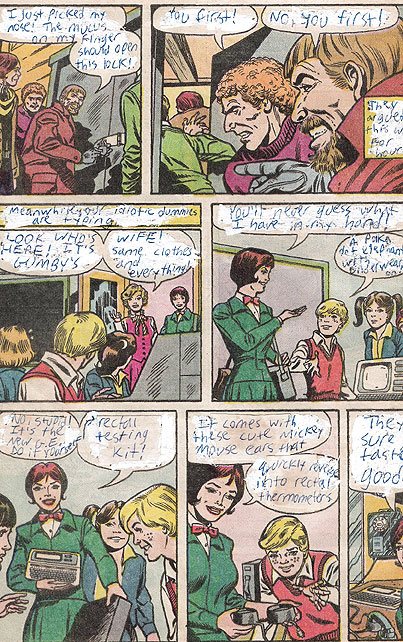 Man #1: I just picked my nose! The mucus on my finger should open this lock! Man #2: You first! Man #1: No, you first! They argued this way for hours. Meanwhile, our idiotic dummies are typing. Mrs. Buttface: LOOK WHO'S HERE! IT'S GUMBY'S WIFE! Same clothes and everything! Mrs. Gumby: You'll never guess what I have in my hand! Cecil: A polka dot elephant with underwear on! Mrs. Gumby: No, stupid! It's the new G.E. Do it yourself rectal testing kit! Mrs. Gumby: It comes with these cute Mickey Mouse ears that quickly reverse into rectal thermometers. Mrs. Gumby: They sure taste good.
